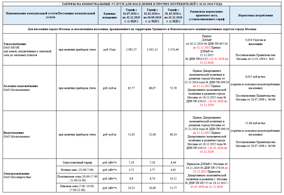 С 1 февраля 2026 года в Москве вступают в силу новые тарифы на коммунальные услуги. Представляем вам таблицу с изменениями.